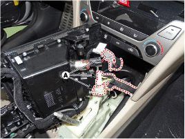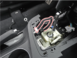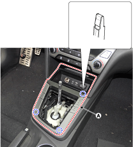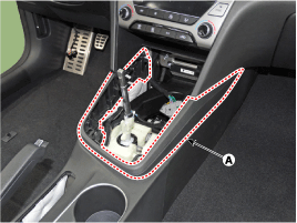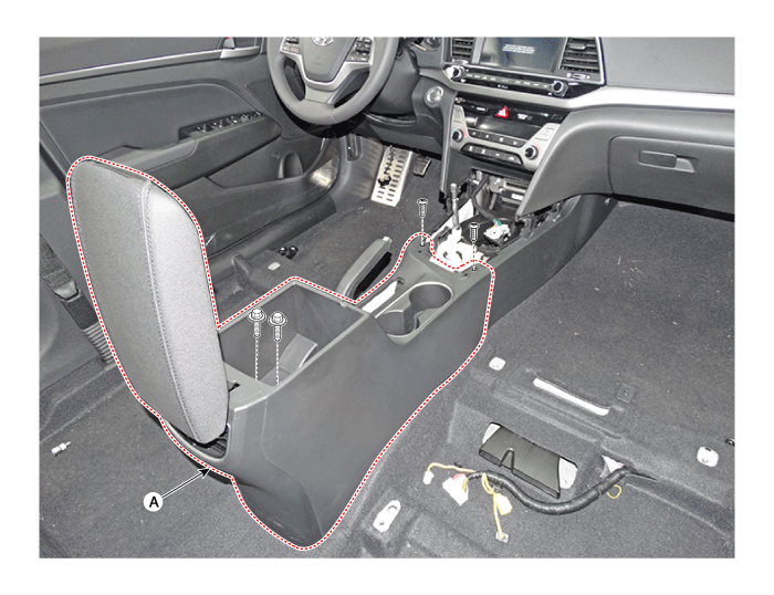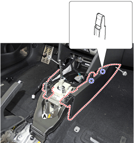 After loosening the mounting screws and bolts, remove the floor console assembly (A).