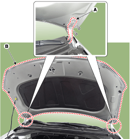 After loosening the hood hinge (A) mounting bolts, remove the hood assembly (B).