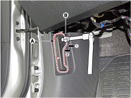 After loosening the hinge (A) mounting bolt, adjust the hood (B) by moving it up and down or from side to side and tighten the bolt.