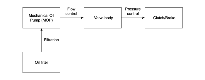 The oil pump is powered by the engine. ATF passes through the oil filter and gets distributed along the oil channels.