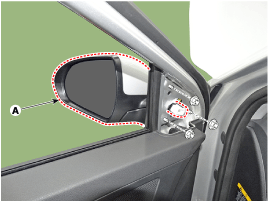 After loosening the mounting nuts, remove the outside rear view mirror (A).