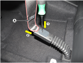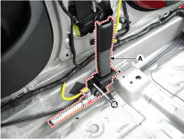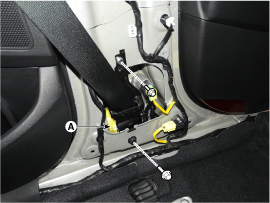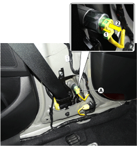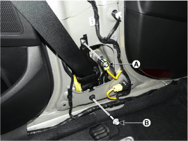 Remove the seat belt pretensioner (A) after loosening the seat belt pretensioner mounting bolts.