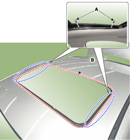 Inspect the step height between the roof panel (A) and the glass weatherstrip (B) and then adjust it if necessary.